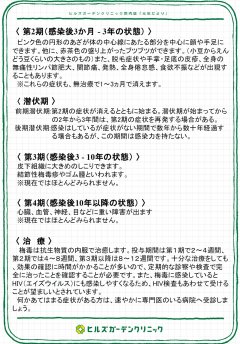 前期潜伏期:第2期の症状が消えるとともに始まる。潜伏期が始まってからの2年から3年間は、第2期の症状を再発する場合がある。