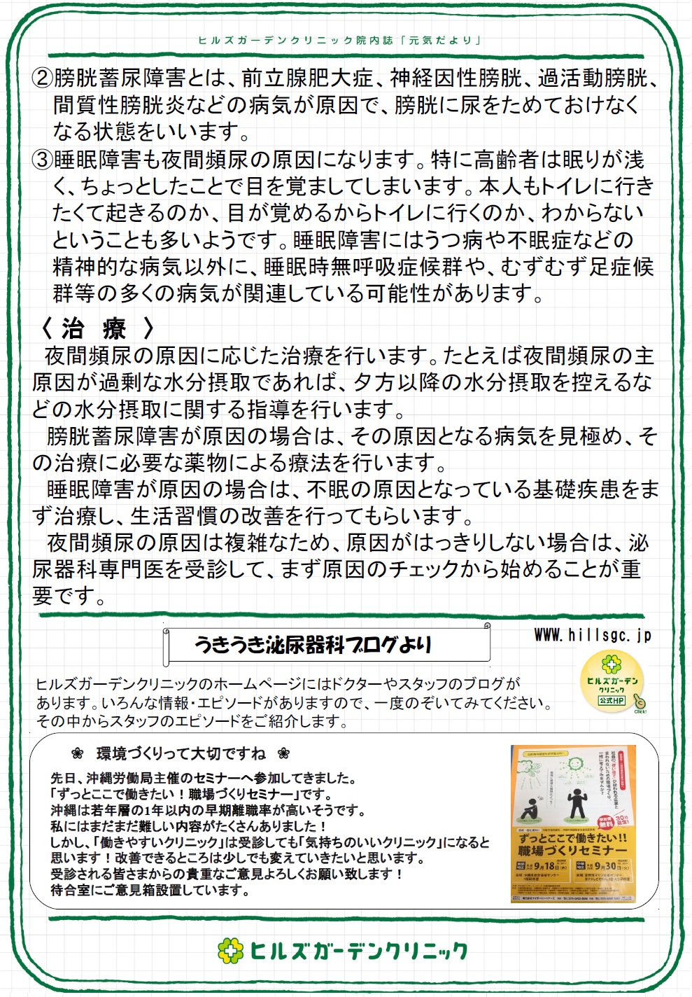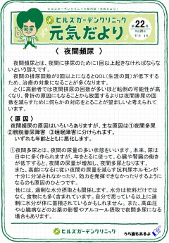 ③睡眠障害も夜間頻尿の原因になります。特に高齢者は眠りが浅く、ちょっとしたことで目を覚ましてしまいます。本人もトイレに行きたくて起きるのか、目が覚めるからトイレに行くのか、わからないということも多いようです。睡眠障害にはうつ病や不眠症などの精神的な病気以外に、睡眠時無呼吸症候群や、むずむず足症候群等の多くの病気が関連している可能性があります。