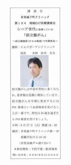 2011/09/20 首里城下町クリニック 第104回 地域むけ医療講演会 9月27日(火)19時より首里城下町クリニック第一の2階にて首里城下町クリニック 第104回 地域むけ医療講演会が行われます。 首里城下町クリニック院長の田名毅先生のご厚意により、講演させていただくことになりました。 テーマは「シニア世代に急増している前立腺がん ~前立腺検診(PSA検査)で早期発見~」です。 興味がある方は、お気軽のご参加ください。